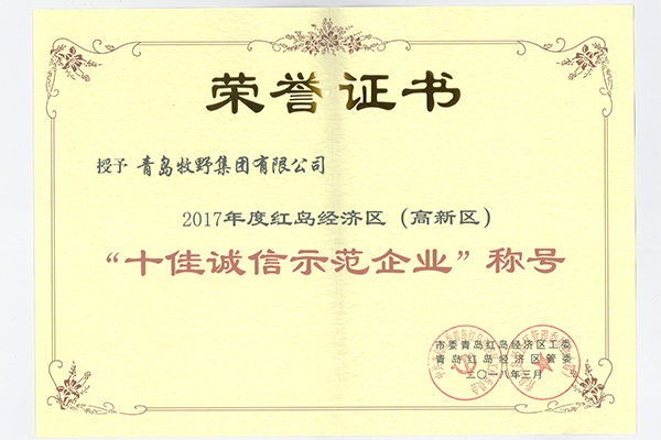 青島牧野集團(tuán)有限公司獲得市委青島紅島經(jīng)濟(jì)區(qū)工委、青島紅島經(jīng)濟(jì)區(qū)管委聯(lián)合授予的2017年度紅島經(jīng)濟(jì)區(qū)(高新區(qū))“十佳誠信示范企業(yè)”稱號